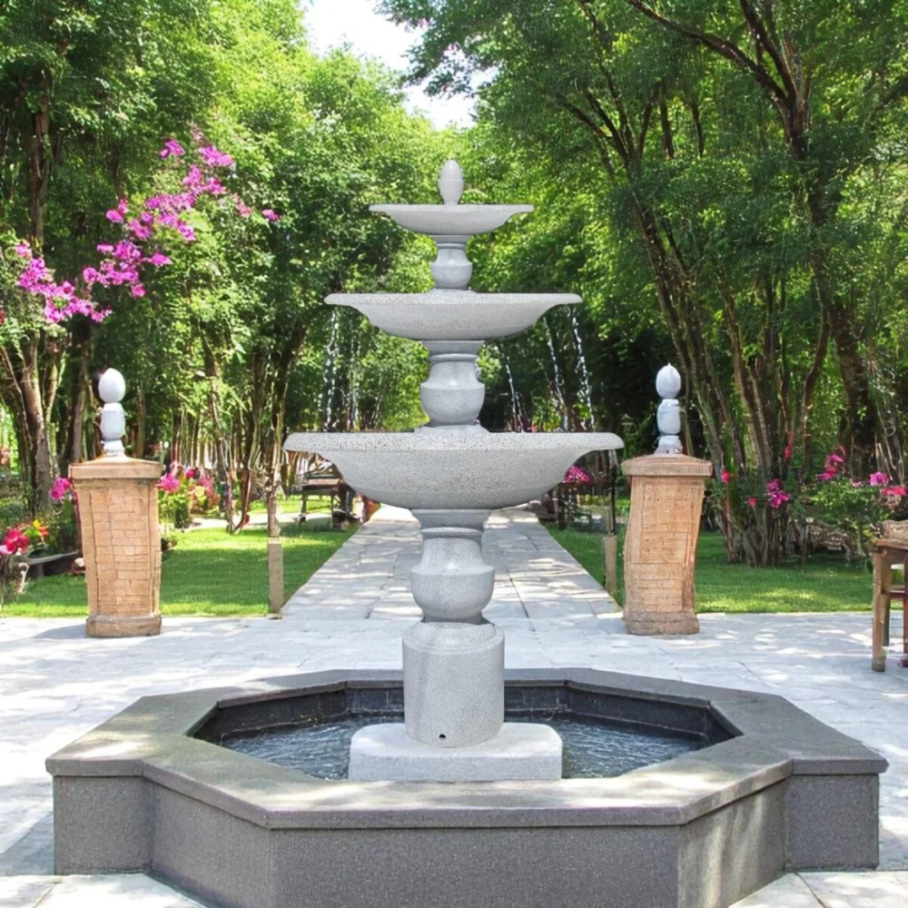 Đài phun nước sân vườn 3 tầng là thiết kế đài phun nước sân vườn phổ biến và dễ nhận biết nhất. Khái niệm đơn giản về đài phun nước hai tầng và ba tầng có thể được thực hiện theo nhiều cách và kích cỡ.