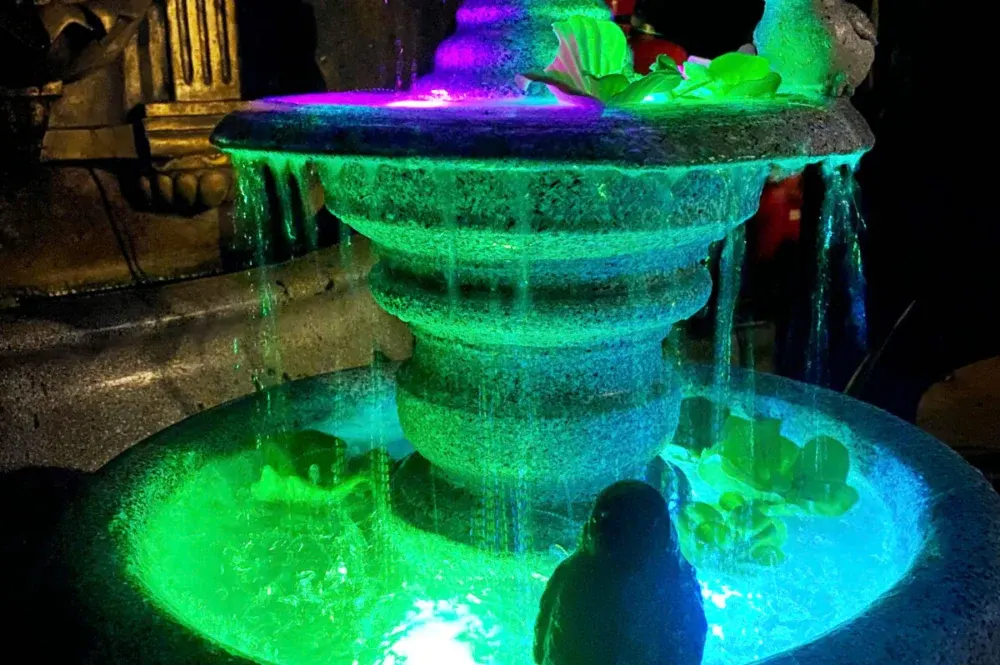 Nước sẽ tự động tuần hoàn qua các tầng. Bạn bắt đầu thưởng thức tiếng nước chảy róc rách, ánh đèn điện ấm áp