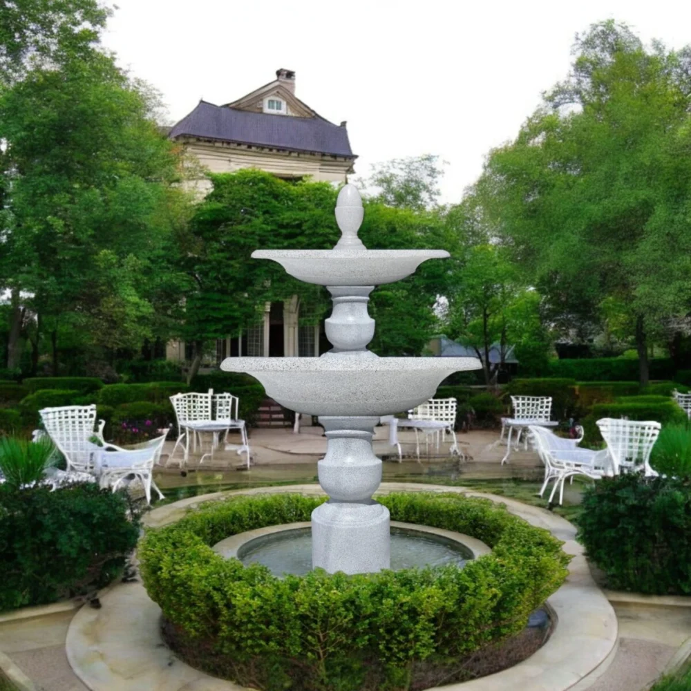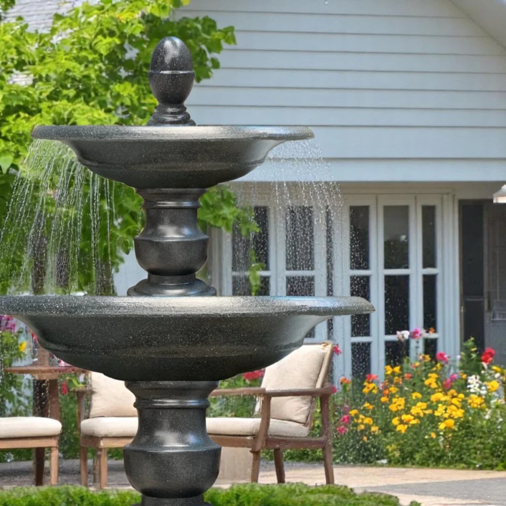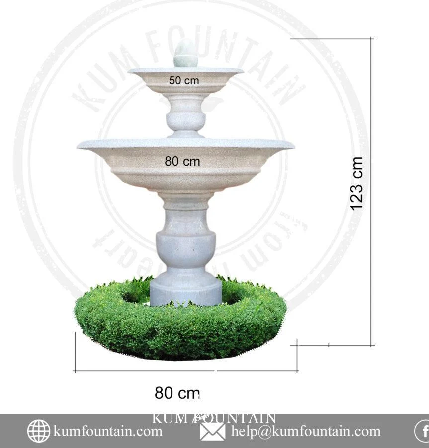 Đài phun nước tiểu cảnh 2 tầng ngoài trời tuyệt đẹp này được thiết kế trông giống như đá được chạm khắc. Nó được đúc từ Glass Fiber Reinforced Concrete có ưu điểm là nhẹ nên bạn có thể dễ dàng di chuyển hoặc cất giữ đài phun nước này và rất dễ dàng để làm sạch. Glass Fiber Reinforced Concrete cực kỳ bền, khiến nó trở thành vật liệu lý tưởng cho đài phun nước ngoài trời. Nước sẽ chảy từ tầng trên xuống bồn dưới cùng một cách duyên dáng, nơi nó tuần hoàn với sự trợ giúp của máy bơm tuần hoàn điện. Đài phun nước tuyệt đẹp này được thiết kế với các khe hở ở vành để dẫn nước từ lưu vực này sang lưu vực khác thành những dòng suối mỏng, thanh lịch.